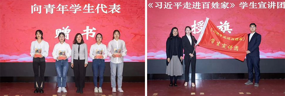 活动现场,与会领导为《习近平走进百姓家》学生宣讲团授旗并赠书,鼓励宣讲团成员深刻领悟领袖为民情怀,用青年人听得懂、听得进的话语,把党的声音和习近平总书记的关怀传递到广大青年心中,滋润青年心田。