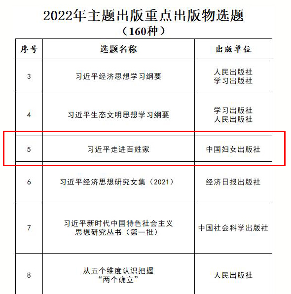 2022年9月7日,中央宣传部办公厅印发通知,公布了2022年主题出版重点出版物选题。此次报送的主题出版选题2240种,经评选论证,确定2022年主题出版重点出版物选题160种,其中,图书选题140种、音像电子出版物选题20种。由全国妇联组织编写、出版发行的《习近平走进百姓家》入选。通知要求,各地区各部门各出版单位要切实抓好重点出版物的组稿、编辑、校对、印制、发行等环节,同时做好展示展销工作,在各地书城、书店设立专门区域,集中展示展销重点出版物,对读者购书给予优惠,组织形式多样的推广活动着重宣传相应题材内容的重点出版物。