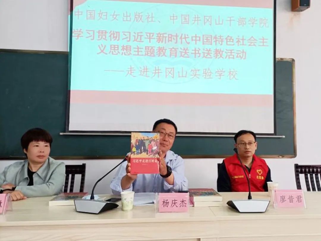 杨庆杰同志首先向井冈山实验学校老师们介绍了由全国妇联组织编写的《习近平走进百姓家》一书。该书通过32个家庭的朴实故事和感人场景,生动讲述了习近平总书记考察调研期间走进百姓家中,问生计冷暖、察民情民愿、讲惠民政策的感人故事,真实记录了新时代十年一个个普通家庭翻天覆地的变化,深刻展现了大国与小家、领袖与百姓的血肉联系,展现出总书记的为民情怀和赤子之心。
