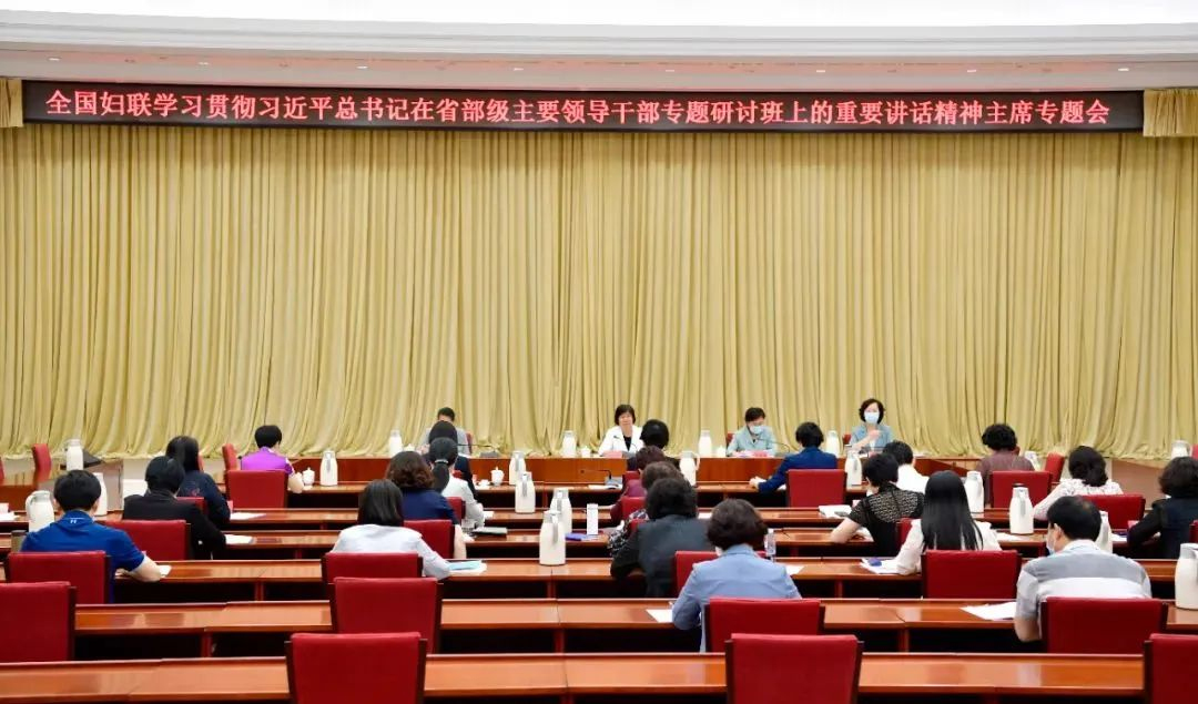 会议指出,在党的二十大即将召开的重要时间节点,党中央举办省部级主要领导干部专题研讨班,习近平总书记发表重要讲话,对于进一步统一全党全国各族人民思想,凝聚共识,以实际行动迎接党的二十大胜利召开具有重大意义。习近平总书记重要讲话科学分析了当前国际国内形势,深刻阐述了过去5年工作和新时代10年的伟大变革,深刻阐明了关系党和国家事业发展的一系列重大理论和实践问题,高屋建瓴、视野宏大、内涵丰富、思想深邃,具有很强的政治性、理论性、指导性,是闪耀着马克思主义思想光辉的纲领性文献,是确保党和国家事业始终沿着正确方向胜利前进的政治宣示,是激励全党全国各族人民奋进新征程、建功新时代的政治动员,为开好党的二十大奠定了重要的政治基础、思想基础和理论基础。各级妇联要深刻认识党的二十大对团结和激励全国各族人民为夺取中国特色社会主义新胜利而奋斗具有十分重大的意义;深刻认识党的十九大以来取得的新的历史性成就和新时代的历史性变革,最根本在于有习近平总书记作为党中央的核心、全党的核心掌舵领航,在于有习近平新时代中国特色社会主义思想的科学指引;深刻认识习近平新时代中国特色社会主义思想是党和国家必须长期坚持的指导思想;深刻认识党的全面领导、党中央集中统一领导是不断夺取新时代中国特色社会主义新胜利的根本保证;深刻认识推进和拓展中国式现代化是新时代坚持和发展中国特色社会主义在理论和实践上的创新突破;深刻认识人民是党的力量之源和胜利之本,进一步把思想和行动统一到习近平总书记重要讲话精神上来,引导广大妇女为保持平稳健康的经济环境、国泰民安的社会环境、风清气正的政治环境作出新的更大贡献,为奋力谱写全面建设社会主义现代化国家崭新篇章发挥“半边天”作用。