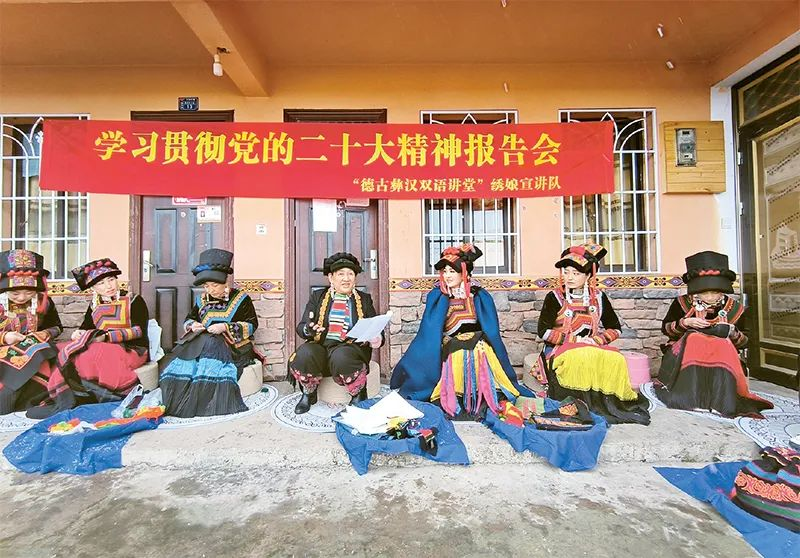 2023年1月15日,在四川省乐山市峨边彝族自治县茗新村,绣娘宣讲队向群众宣讲党的二十大精神。绣娘宣讲是峨边基层理论宣讲形式之一,重点面向农村妇女,利用彝族刺绣培训、农民夜校、坝坝会座谈等活动开展宣讲,传递党和政府声音,讲解各类政策,述说发展变化,树立文明新风。全国妇联供图